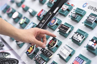 8月16日,观众在第十届中国电子信息博览会上参观数码管显示屏。当日,第十届中国电子信息博览会在深圳会展中心开幕。本届展览以“奋进十载 智创未来”为主题,展会面积达10万平方米,1400余家企业参展。