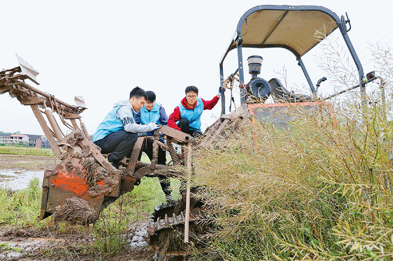 图为2023年4月29日,南华大学的大学生志愿者利用五一假期到湖南省衡阳市衡阳县西渡镇新桥村开展劳动助农行动,帮助农民检修、保养农机,用劳动实践助力乡村振兴。 新华社发 曹正平/摄