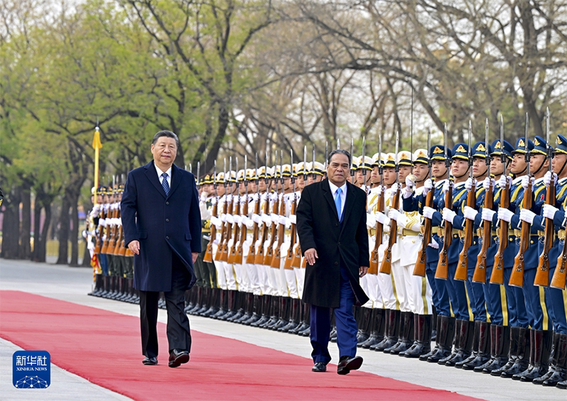 4月9日下午,国家主席习近平在北京人民大会堂同来华进行国事访问的密克罗尼西亚联邦总统西米纳举行会谈。这是会谈前,习近平在人民大会堂东门外广场为西米纳举行欢迎仪式。(新华社记者 殷博古/摄)