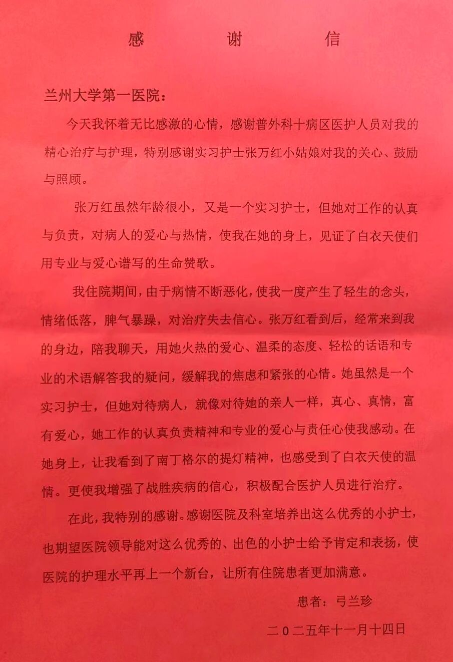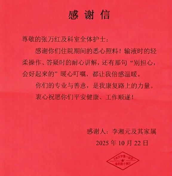近日,我院两名护理专业实习生李晨、张万红在兰州大学第一医院多个科室实习期间表现优异,先后收到医院护理部、实习科室及患者家属的书面表扬。她们在普外科、内分泌科、康复科等不同岗位的扎实表现,展现出我院学子全面的专业素养与持续的成长轨迹。