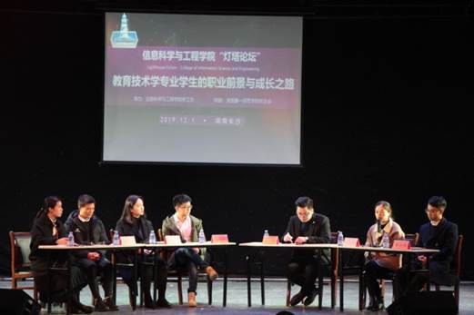 12月1日下午,信息科学与工程学院精心筹备的“灯塔论坛”在特立楼实验剧场隆重开讲。此次活动邀请了教育技术学专业近年来毕业的优秀校友文豪、于飞克、唐蓉琪、唐琬晴、曹向荣、杨林、易青山、汤响亮,就“教育技术学专业学生的职业前景与成长之路”为在校学生进行经验分享。学院领导王杰文、田祖伟、成夏炎及学校校友会廖跃华出席活动,学院辅导员及教育技术学专业学生代表近三百人参加。
