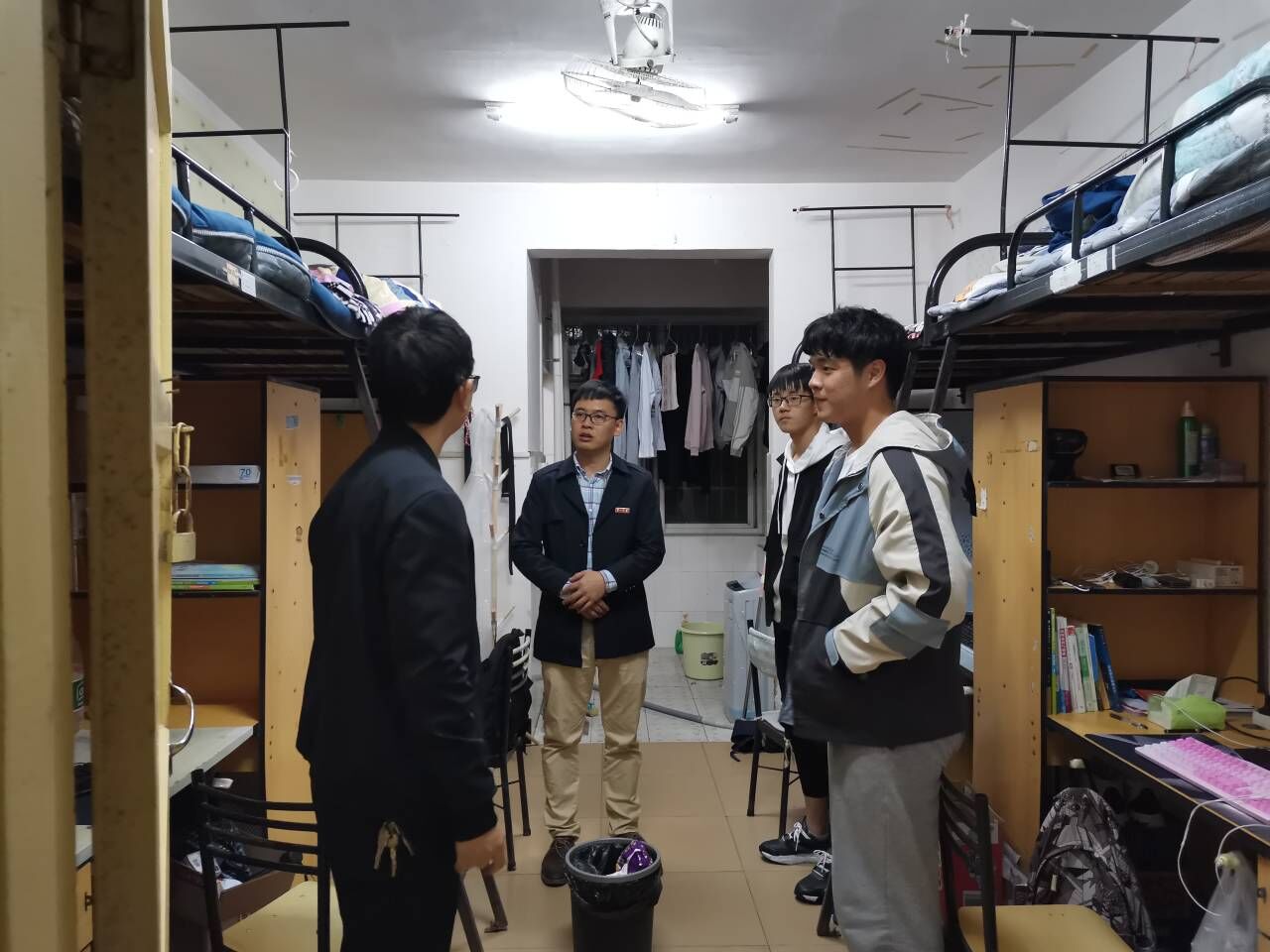 2020年10月27日下午六点整,beat365党总支书记王杰文教授、副院长田祖伟教授、何向阳教授、党总支副书记成夏炎博士带领辅导员和学生干部到4栋、11栋、12栋、13栋、14栋学生宿舍看望学生,检查寝室学风、文明卫生、内务整理,进行安全隐患排查;详细了解学生近期思想、学习和生活情况,从寝室环境、学习氛围、文明礼仪等方面进行宣传和教育引导。