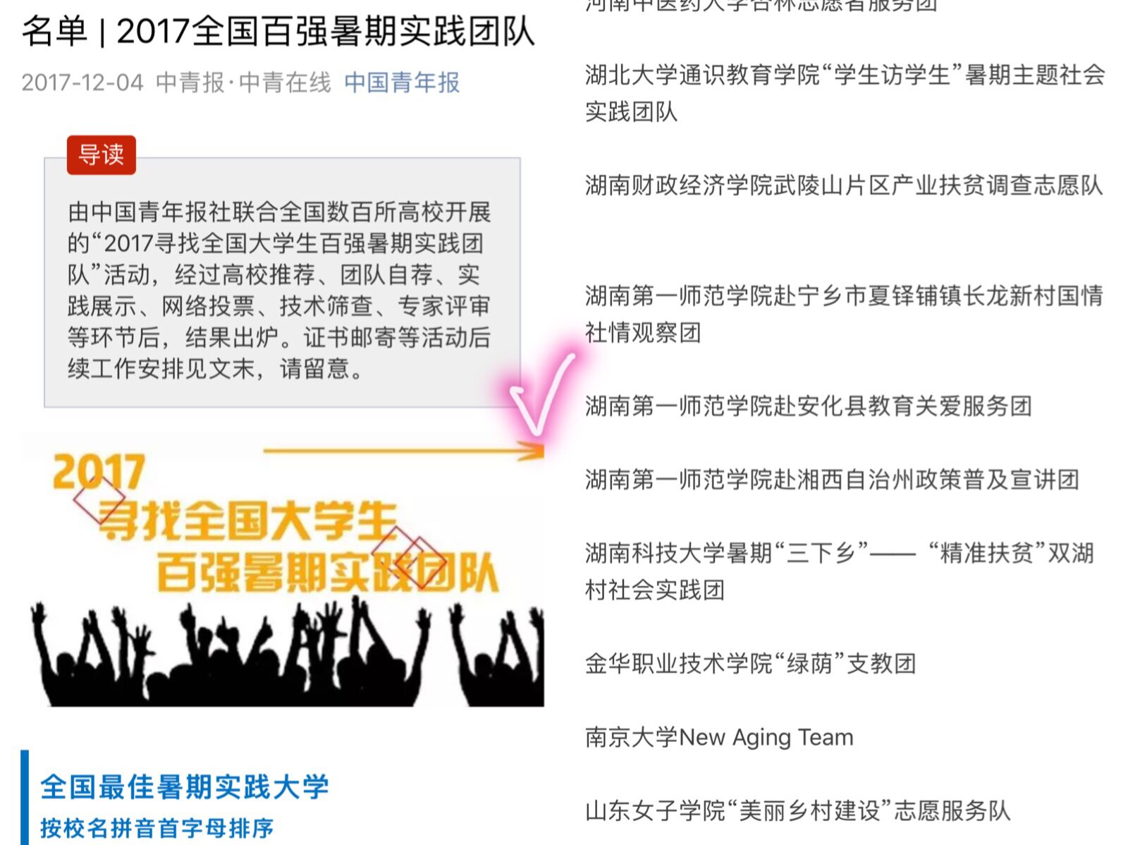 在团中央未来网启动的“奋斗中国梦·实践致青春2017年全国大中专学生暑期‘三下乡’新媒体公益传播力展示活动”中,beat365三下乡团队“赴安化县‘重走主席游学路’教育关爱服务团”成功入围“优秀团队”、“优秀报道”和“最美中国发现”奖项,学院辅导员唐瑞鸿入围“优秀指导老师”奖项。