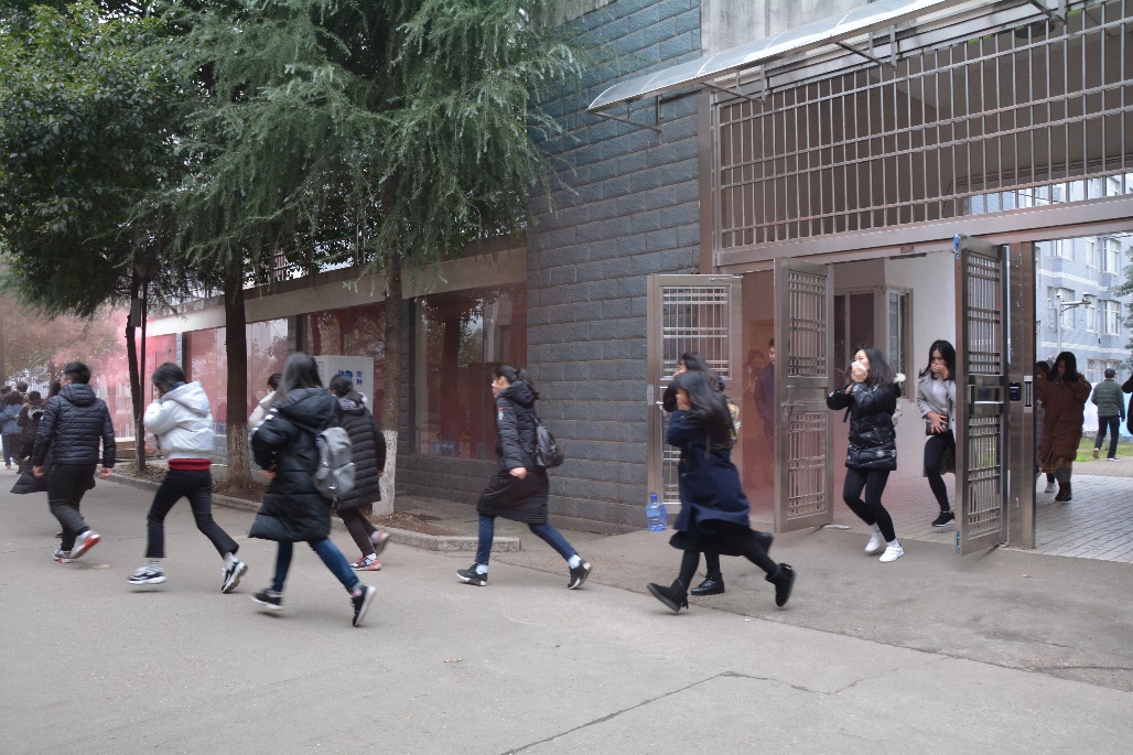 讲座后,为达到学以致用的效果,提高学生们应对火灾突发事件的自救能力,beat365于学生公寓12栋组织了一场应急疏散逃生演习。紧张的逃生警报一响,浓烟之中,在各工作人员的指导下,300余名学生1分钟之内快速有序地从“火灾”现场撤离,安全抵达田径场。