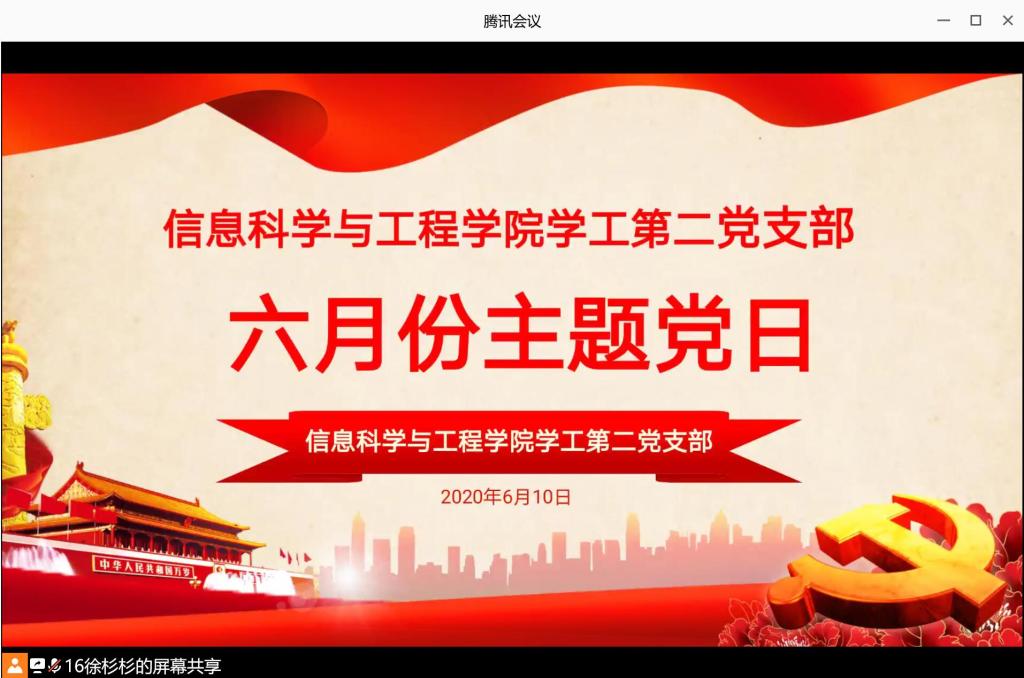 6月10日晚,beat365学工第一、第二党支部利用腾讯会议举行了六月份线上主题党日活动。beat365党总支副书记成夏炎、学工第一党支部书记关红儒、学工第二党支部书记唐瑞鸿、学工办老师叶晶、李荣敬以及全体学生党员参加活动。