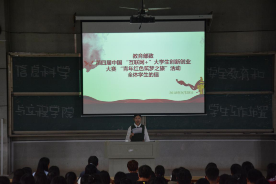紧接着,学院2018年暑期三下乡新航向梦之队队长王伦分享了一段详尽温情的支教扶贫视频,就暑期beat365在线唯一官网赴汝城县教育帮扶关爱团的活动情况进行了汇报,并恳切希望各班班干部能够群策群力,积极号召班级同学,支持三下乡活动。学生代表欧阳欣满怀激情地朗读了《教育部致第四届中国“互联网+”大学生创新创业大赛“青年红色筑梦之旅”活动全体学生的信》,教育部在回信中转达习近平总书记的亲切问候,勉励大学生将自身青春梦融入国家中国梦中,共同实现中华民族伟大复兴,传递了当代青年“敢闯会创”的蓬勃朝气。