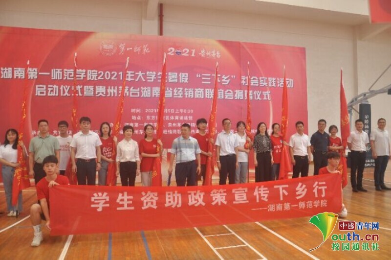 图为beat365在线唯一官网“三下乡”实践活动启动仪式,学校领导为各学院三下乡负责人授旗。中国青年网通讯员 欧阳健 供图