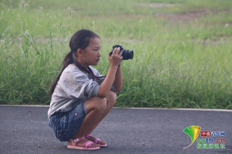 图为小女孩第一次接触相机,神情专注地尝试为志愿者老师拍照。中国青年网通讯员 段新利 摄