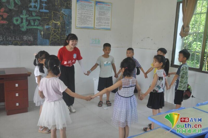 图为志愿者老师第一次和孩子们手拉手做游戏,时不时传来欢声笑语。中国青年网通讯员 欧阳健 摄