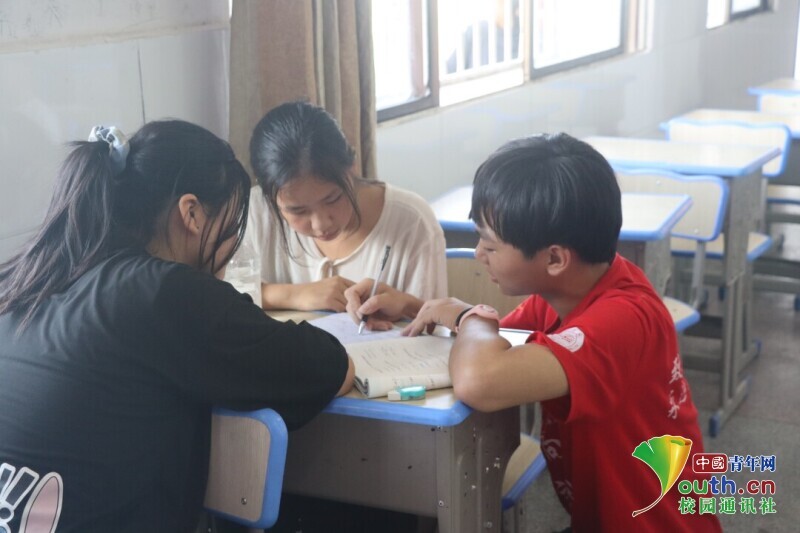 图为志愿者耐心仔细地教孩子们写暑假作业。中国青年网通讯员 欧阳健 摄
