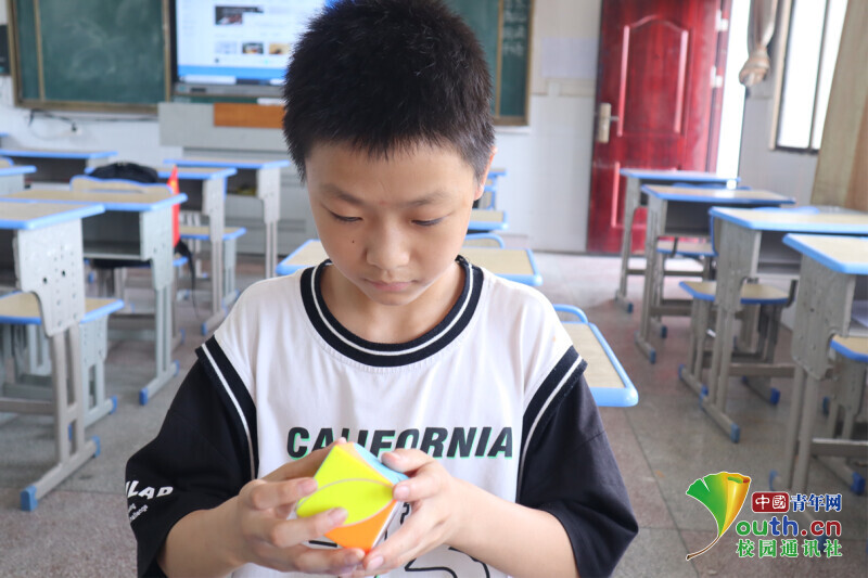 图为孩子有一个魔方大师梦,正在研究新航向·梦之队带来的魔方。中国青年网通讯员 欧阳健 摄