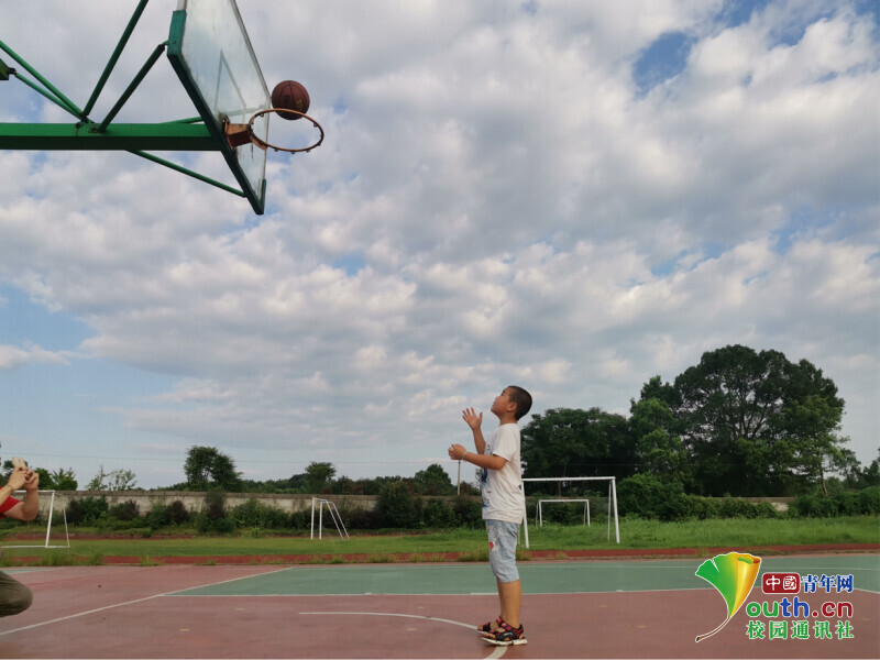 图为孩子有一个篮球梦,在经历多次篮球训练后终于投进篮筐。中国青年网通讯员 欧阳健 摄