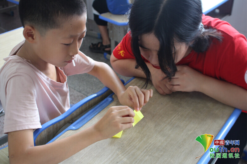 图为孩子有一个折纸梦,在与新航向·梦之队队员分享折纸技巧。中国青年网通讯员 段新利 摄