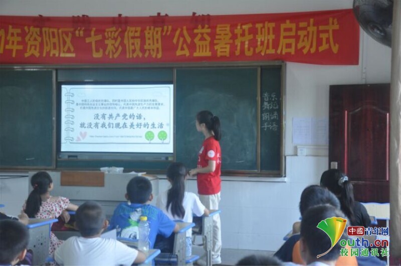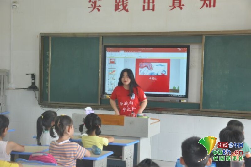 图为队员指导孩子们歌唱《没有共产党就没有新中国》。中国青年网通讯员 何星逸 摄