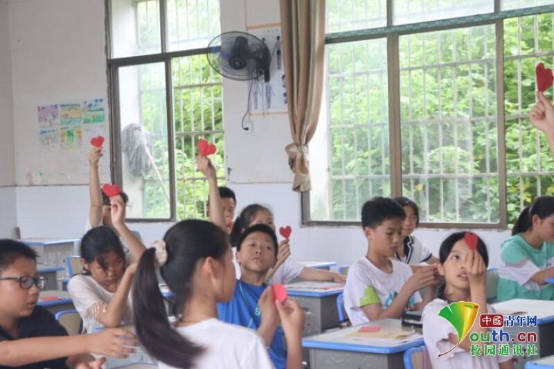 图为孩子们高高举起自己完成的“红心”作品。中国青年网通讯员 欧阳健 摄