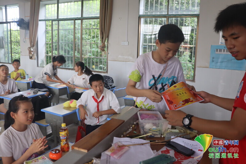 图为新航向梦之队队员给每个班表现优异的学生颁发奖状。中国青年网通讯员 段新利 摄