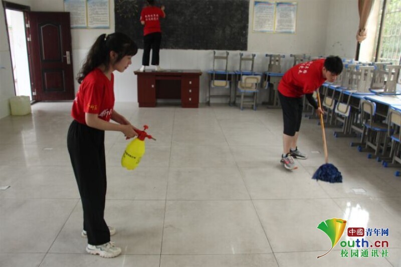 图为队员对学习场所进行进行全面消毒和打扫,为孩子们上课提供一个安全、卫生、舒适的学习环境。中国青年网通讯员 欧阳健 摄
