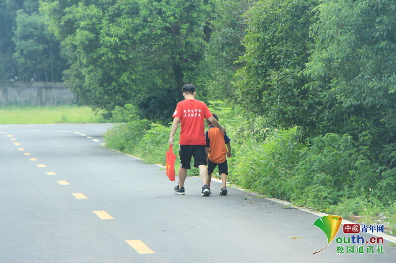 图为志愿者正在护送孩子上学,并在途中与孩子交谈。中国青年网通讯员 何星逸 摄