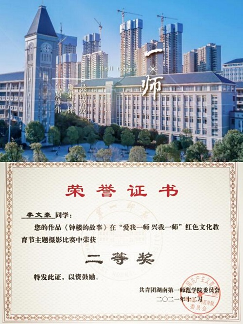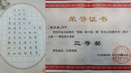 此次红色文化教育节还包括三笔字比赛、征文比赛、摄影比赛。获奖优秀作品在颁奖典礼现场陈列展出。beat36519级818教技班李文豪的摄影二等奖作品《钟楼的故事》,20级848教技班黄伊美的三笔字(硬笔)比赛三等奖作品《清平乐》陈列其中。