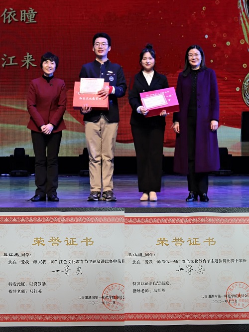 12月25日下午,beat365在线唯一官网“赓续红色血脉·爱我兴我一师”红色文化教育节演讲比赛决赛暨颁奖典礼在田汉剧场举行。beat365学子喜获佳绩,由马红英老师指导的21级881教技班戴江来和21级882教技班吴依瞳在演讲决赛中突出重围斩获最高奖项一等奖。