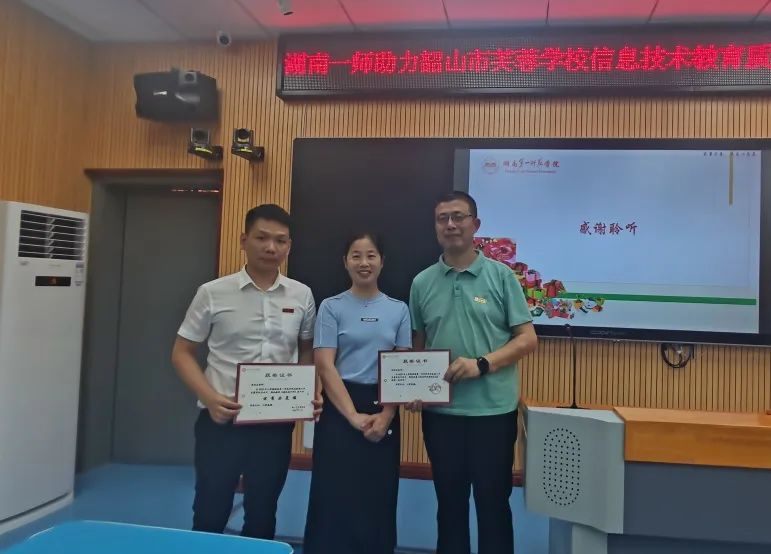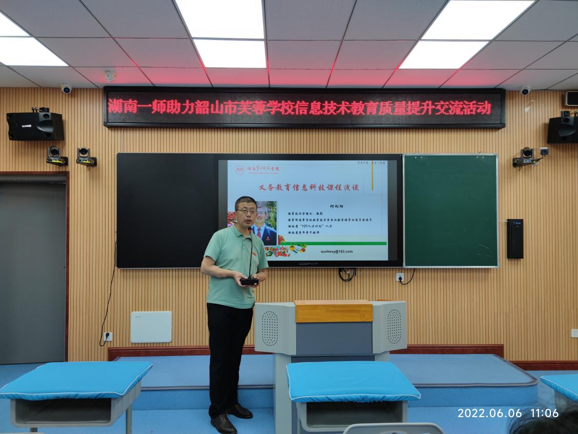 为提升芙蓉学校教育教学质量,实现城乡教育均衡发展,充分发挥我校在基础教育领域的引领示范作用,实现优质资源共享,2022年6月6日,beat365在线唯一官网副院长何向阳带领由教育技术学专业教学论团队成员、长沙市天心区青园小学教师龚宣运、湖南一师第一附属小学教师曹向荣组成的教育技术学帮扶团队,前往韶山市芙蓉学校开展信息技术教育质量提升交流研讨活动。此次活动由韶山市芙蓉学校校长李冬文主持,芙蓉学校全体行政、综艺组全体教师,韶山市各小学信息技术教师代表等参加了此次活动。