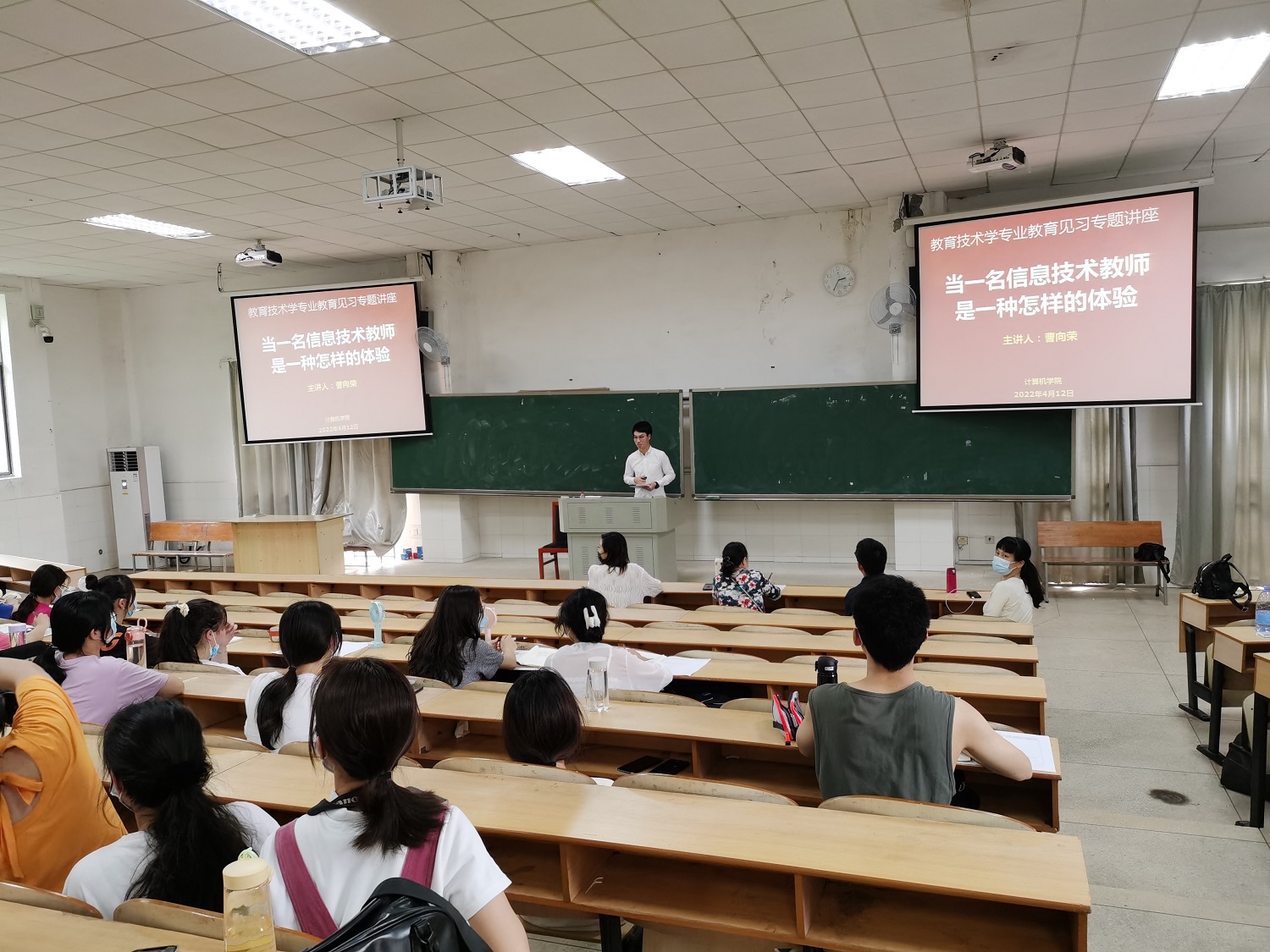 2022年4月12日,2016届优秀毕业生曹向荣受邀在玉衡南201为beat365教育技术学专业学生开展《当信息技术教师是一种怎样的体验》教育见习专题讲座。副院长何向阳、教育见习指导老师、教育技术系部分老师、20教技1班、21级教技881及882班全体同学参加了讲座。讲座由教育技术系副主任刘琳主持,