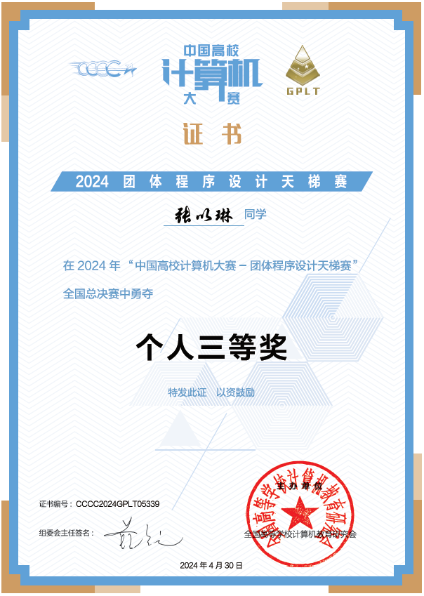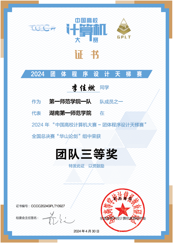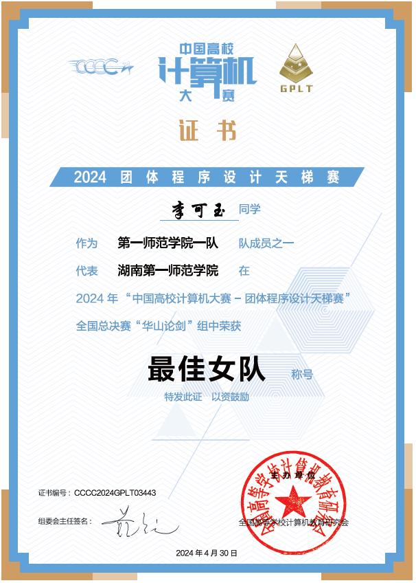 近日,第九届“中国高校计算机大赛-团体程序设计天梯赛(GPLT)”(以下简称“天梯赛”)成绩揭晓,我校代表队获得“华山论剑”组“最佳女队”国家奖(唯一)、国家级团队三等奖、省级团队三等奖和个人国家级三等奖的好成绩,在全国高校排名第217名。