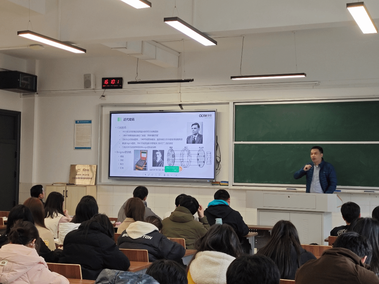 随后,程朝辉在玉衡楼503作题为“密码技术演进、发展及标准化”的专题讲座。他以历史脉络为主线,从古典密码的凯撒加密、二战时期的恩尼格玛密码机,讲到现代公钥体制、香农加密算法、数字信封与数字签名技术,最后延伸至量子计算挑战及我国SM系列算法的国际标准化进程。通过Target数据泄露事件、Juniper VPN漏洞等实际案例,程朝辉生动阐释了密码技术在数据安全中的关键作用,并展望了后量子密码、零知识证明等前沿技术的应用前景。在互动环节,他鼓励学生夯实数学与编程基础,关注国产密码技术发展,努力成长为“通理论、精技术”的复合型人才。讲座现场反响热烈,学生普遍表示对密码学的应用场景与职业发展有了更清晰的认知。