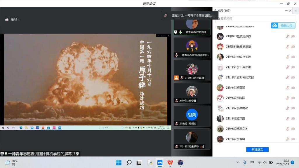 此次活动以线上形式进行,13日晚19点主持人一段昂扬的开场白过后,宣讲活动拉开了帷幕。围绕“党旗高高扬,红色核工业”的主题,丰富的红色‘核’知识以多样的形式呈现在同学们眼前。线上会议共享的,远不止核工业知识,还有家国情怀以及要用心发现生活中美好事物的精神。